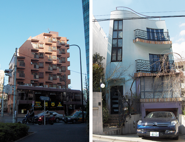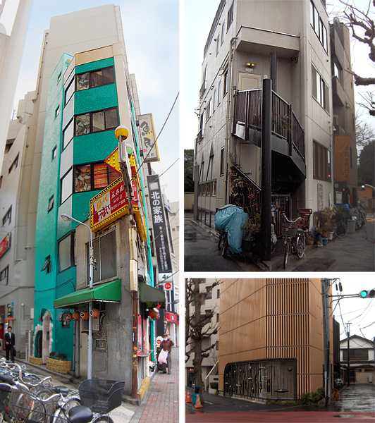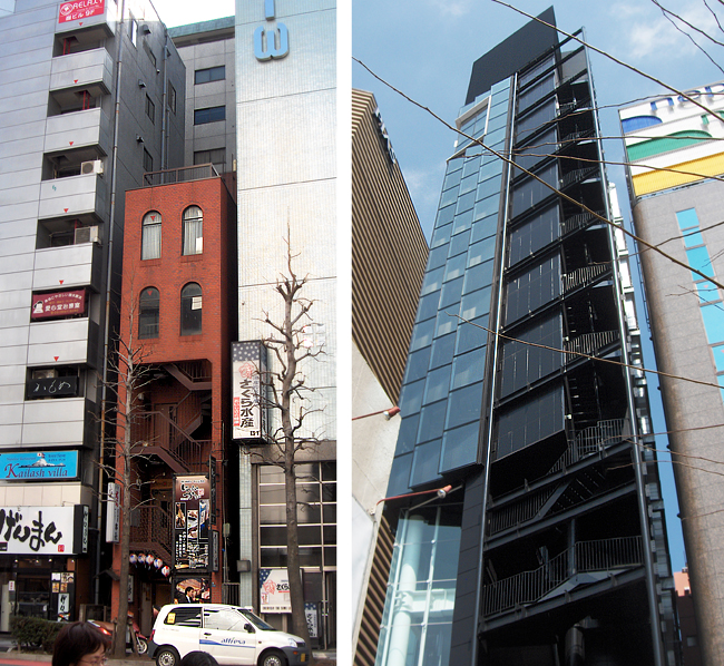 | Can't forget that Tokyo is not exactly spacious; lots of extremely slim and tall buildings, squeezed in between other ones Нельзя забыть, что в Токио довольно непросторно; много узких высоких зданий, зажатых между другими |
