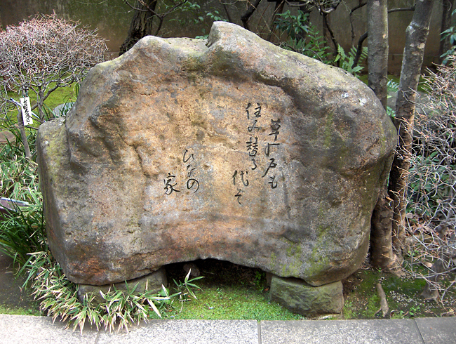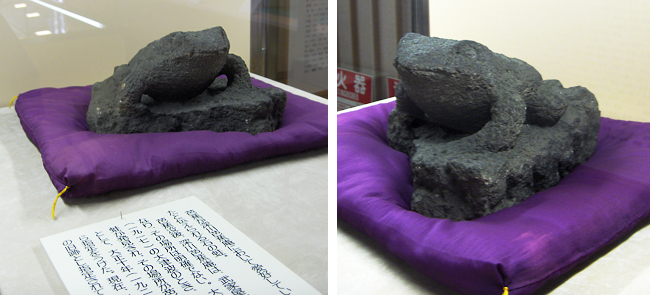 After having written his famous frog haiku right here, in Morishita (now a Tokyo neighborhood), Basho has been given a stone frog, that he treasured. It was pride of Basho Hermitage until the hermitage disappeared, and it was lost. It reappeared in 1917, occasioning the establishment of the Basho shrine. However, it disappeared again in an air raid in March 1945, to be replaced 30 years later in 1975 with a replica.