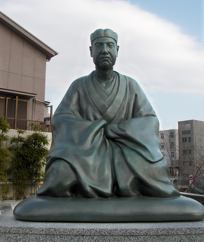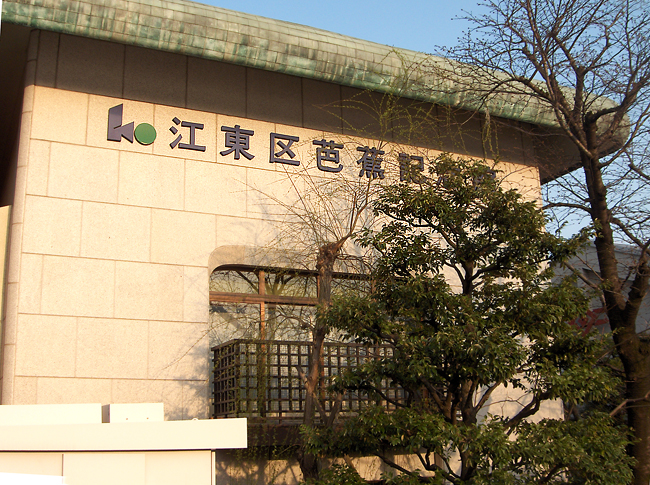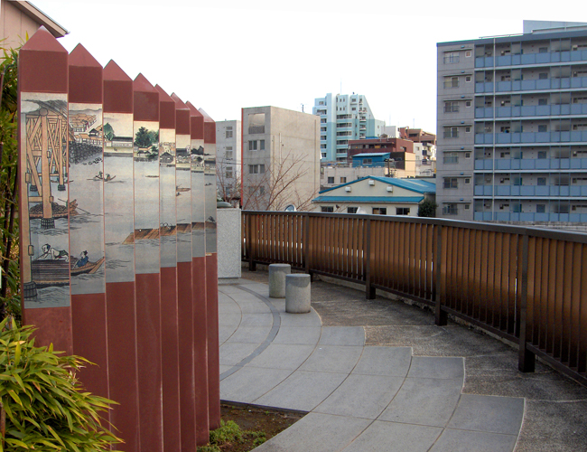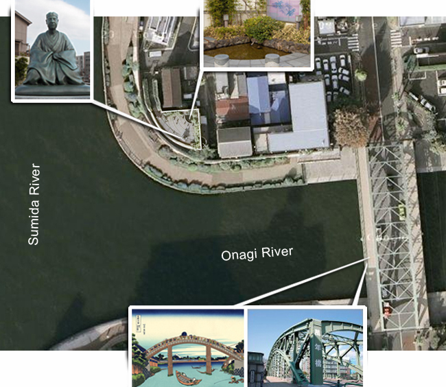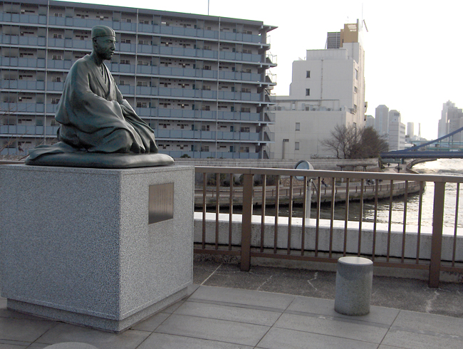 200 meters from the museum, overlooking the confluence of the Sumida and Onagi rivers, is the elevated Basho Memorial Park, officially an annex of the Basho Museum. At the top of a short flight of stairs, it is dominated by a bronze statue of the seated poet, and flanked by Japanese banana plants with a pond full of tadpoles or frogs (depending on the time of year) in one corner. This spot has a touching commemorative significance, since it's herewhere Basho most likely sat, watched over the rivers and bridges, listened to frogs and composed his poems.