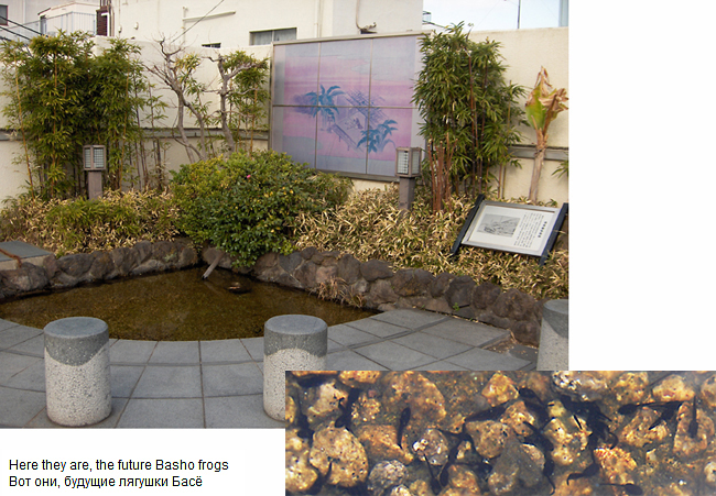 But in 1980, with the inauguration of the Matsuo Basho Museum, a member of the Basho Preservation Society found the frog hidden away in the family safe! После написания своего знаменитого хокку про лягушку именно здесь, в Моришите (ныне район Токио), Басё получил в подарок каменную статую лягушки, которой очень дорожил. Она была гордостью Приюта Басё ("Банановая келья" или "Обитель банановых листьев") , пока приют не исчез, и лягушка была потеряна. Она снова нашлась в 1917 г., что стало причиной основания алтаря/места поклонения Басё. Однако она опять пропала после воздушного рейда в марте 1945, и через 30 лет в 1975 г. была заменена копией. Но в 1980 г., как раз перед открытием Музея Мацуо Басё, член Общества по Сохранению Наследия Басё обнаружил её в одном из семейных сейфов! |
